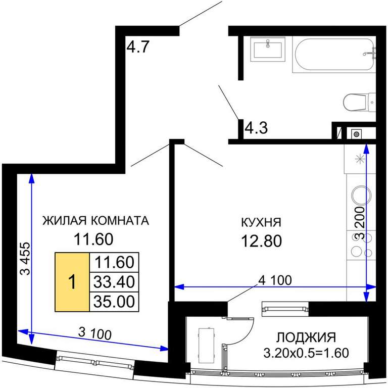 Жилая площадь 11.6 м2, кухня 12.8 м2, предчистовая отделка, комнаты изолированные.