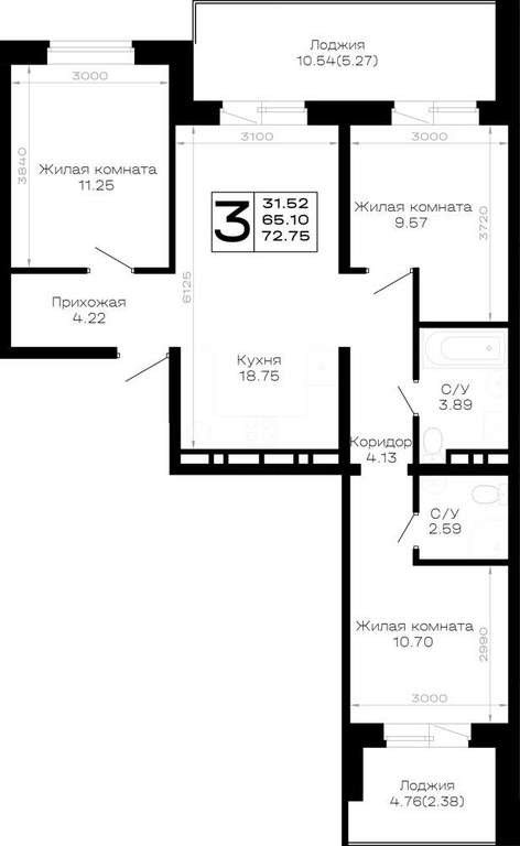 Жилая площадь 31.52 м2, кухня 18.75 м2, предчистовая отделка.