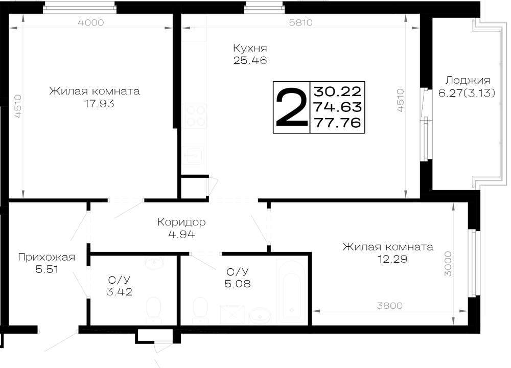 Жилая площадь 30.22 м2, кухня 25.46 м2, предчистовая отделка.