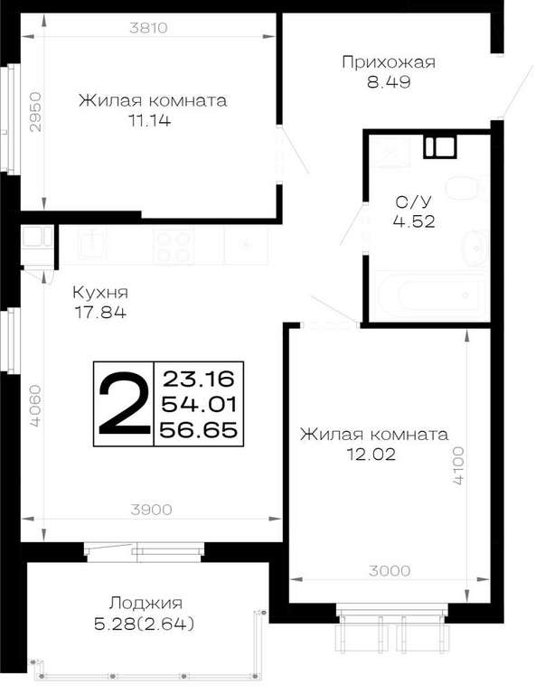 Жилая площадь 23.16 м2, кухня 17.84 м2, предчистовая отделка.