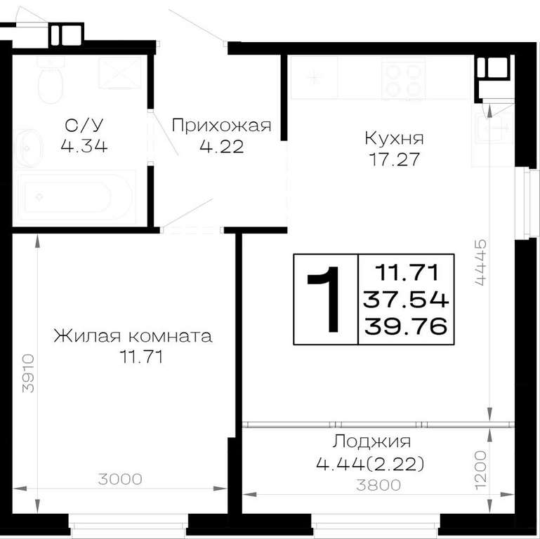 Жилая площадь 11.71 м2, кухня 17.27 м2, предчистовая отделка, комнаты изолированные.