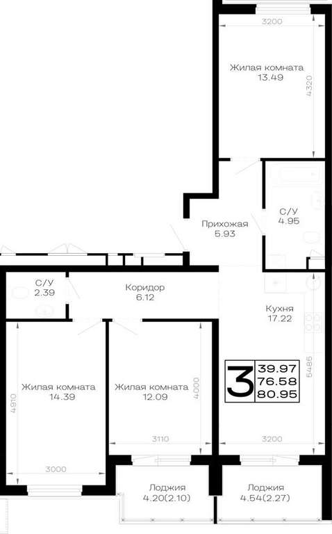 Жилая площадь 39.97 м2, кухня 17.22 м2, предчистовая отделка.