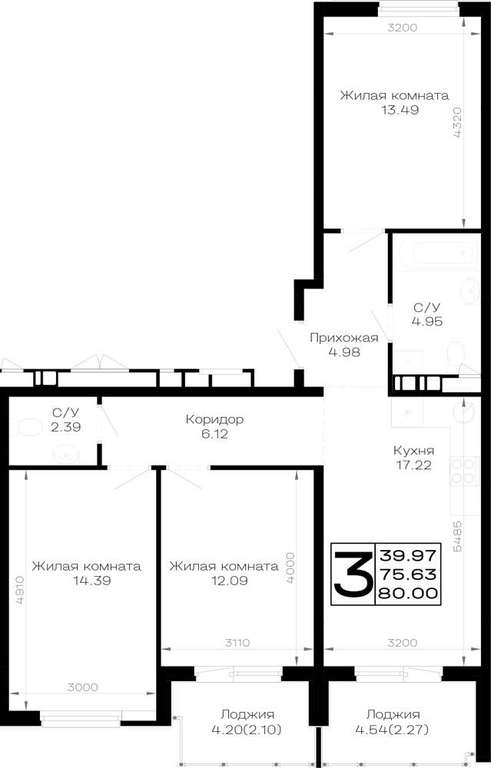 Жилая площадь 39.97 м2, кухня 17.22 м2, предчистовая отделка.