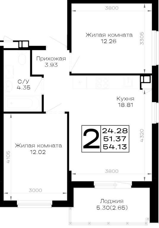Жилая площадь 24.28 м2, кухня 18.81 м2, предчистовая отделка.