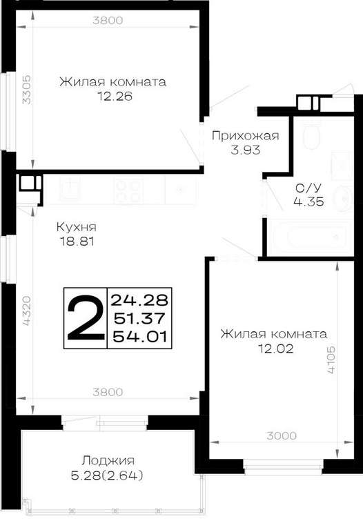 Жилая площадь 24.28 м2, кухня 18.81 м2, предчистовая отделка.